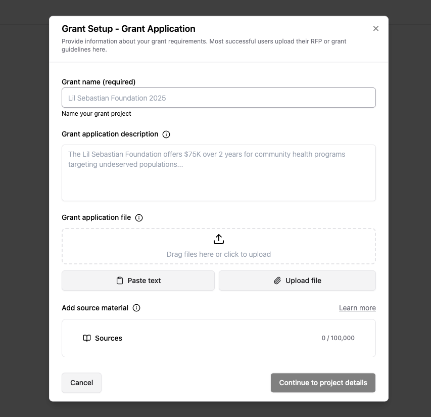 💡 Source materials are your project’s knowledge base. Adding items like past proposals, budgets, staff bios, or mission statements helps the AI produce accurate, tailored drafts.