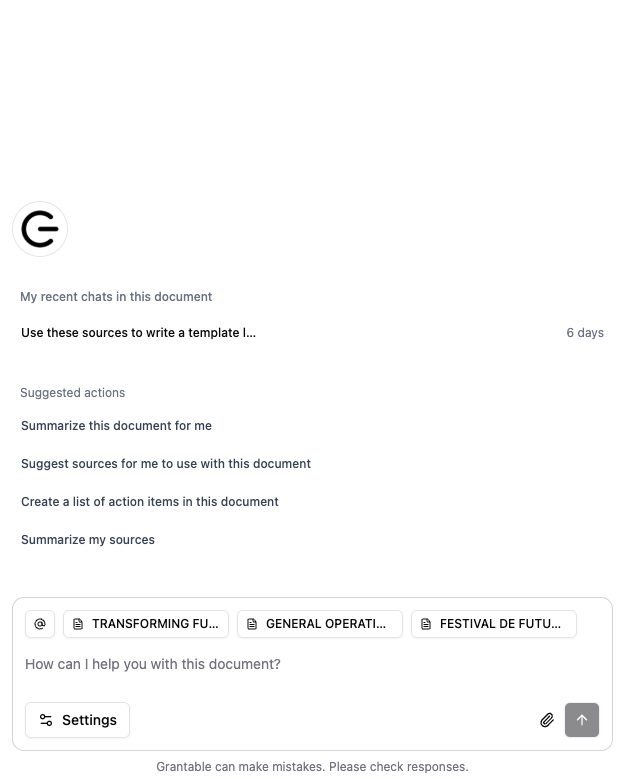 💡 Grants in Grantable are containers for everything related to a single grant application — RFP text, source materials, AI-assisted drafts, assignments, and collaboration.