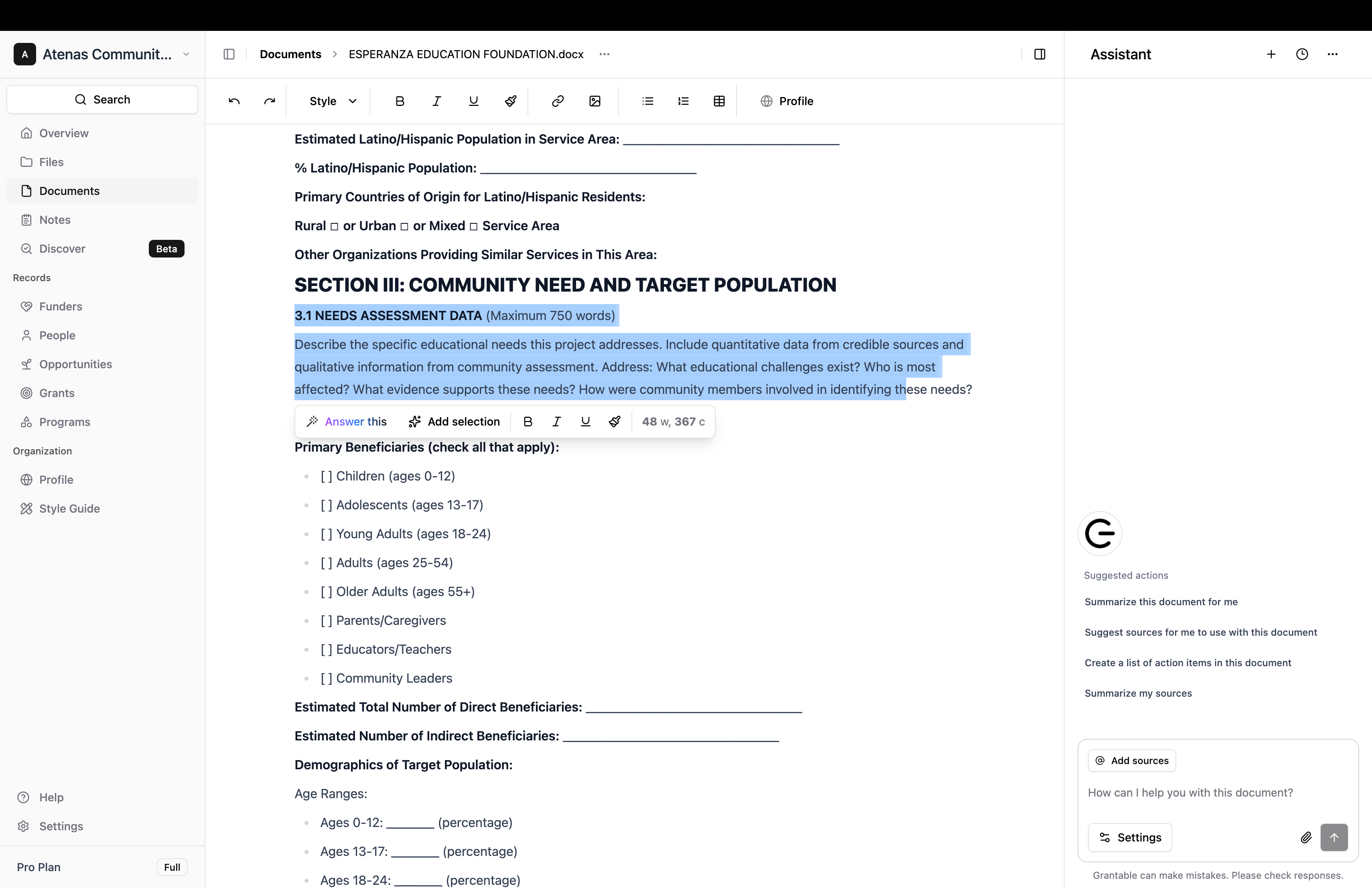 This is the only required field to create a grant application, but adding more information can help your AI assistant generate better content.